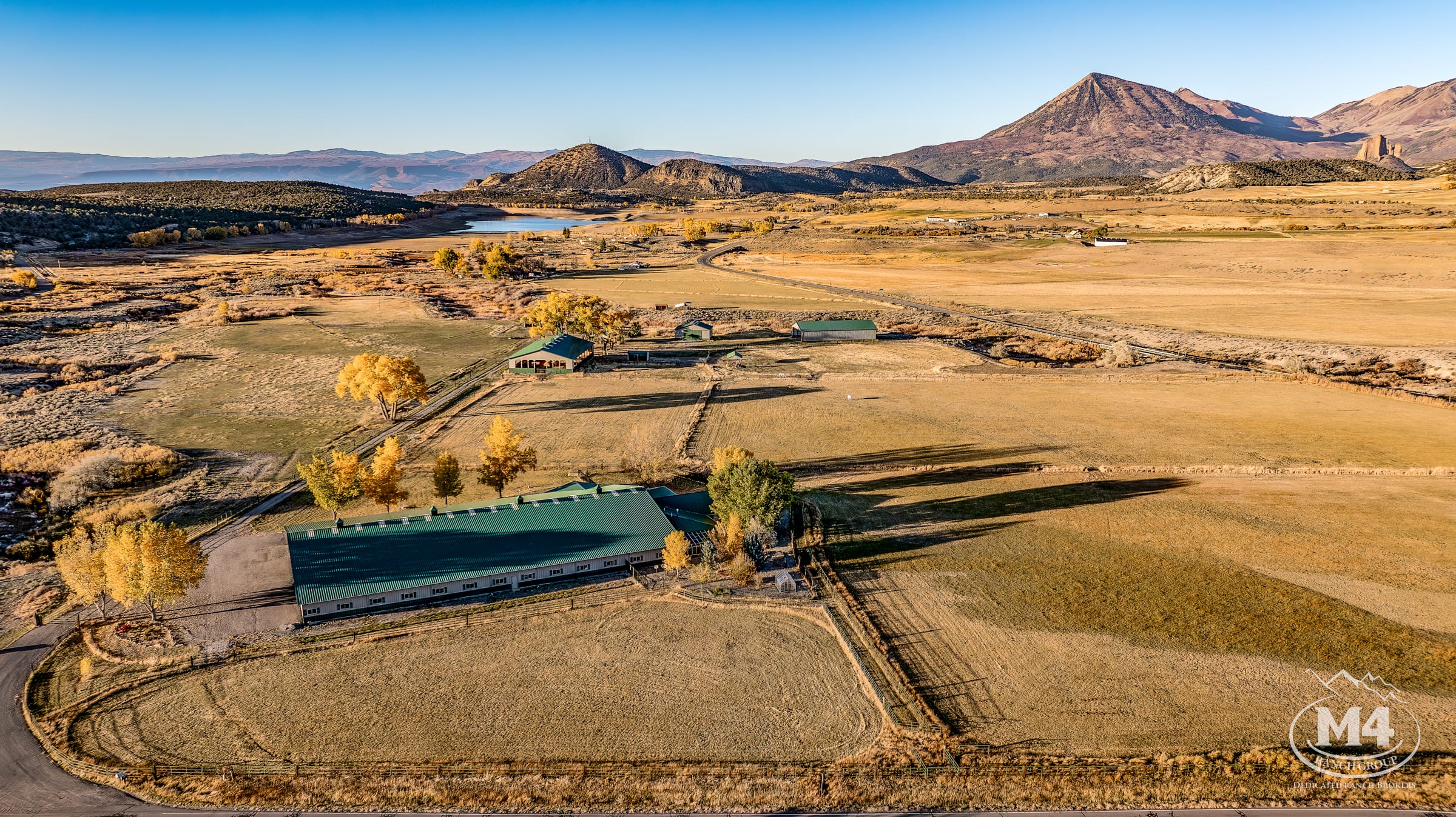 Elk Crest Ranch spans 80± acres with panoramic views of the West Elk Mountains, offering a perfect balance of modern comfort and functional equestrian design. The property features a contemporary single-level home, premium horse facilities including a full-size riding arena and four-stall barn, and additional amenities such as a guest cabin, greenhouse, and irrigated land with two pivots.